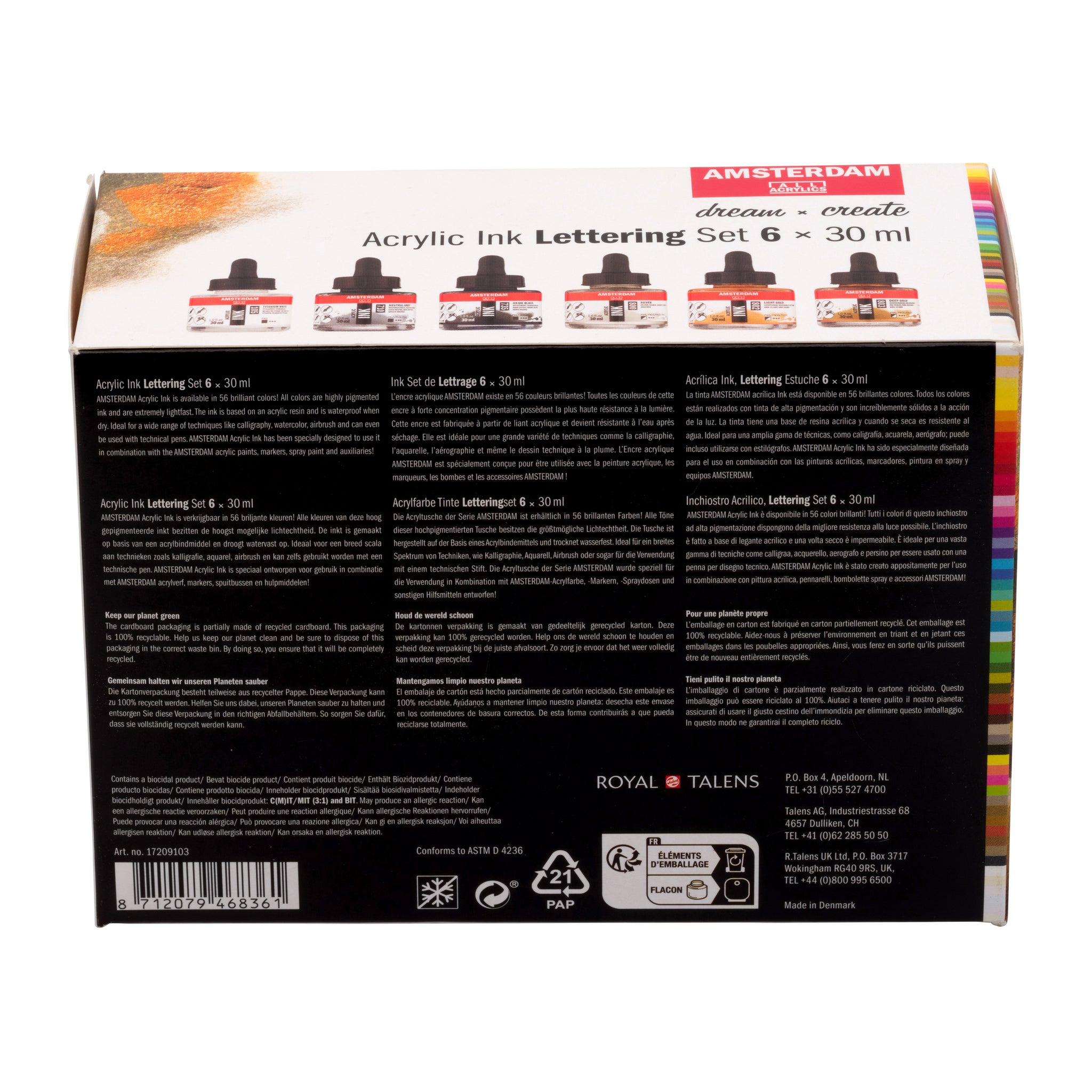 This lettering set contains 6 bottles of Amsterdam acrylic ink in white, grey, black and a selection of metallic colors to create beautiful and bold calligraphy with. Our acrylic ink combines the best properties of ink with the benefits of acrylic paint – the ultra-fluid, vibrant colors don’t fade and dry quickly with a permanent finish.