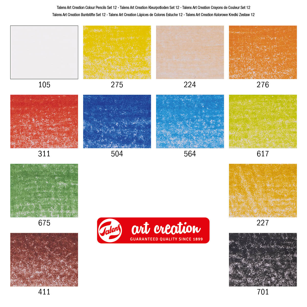 - Talens Art Creation also offers a set of 24 coloured pencils and two sets of graphite pencils in different degrees of hardness.