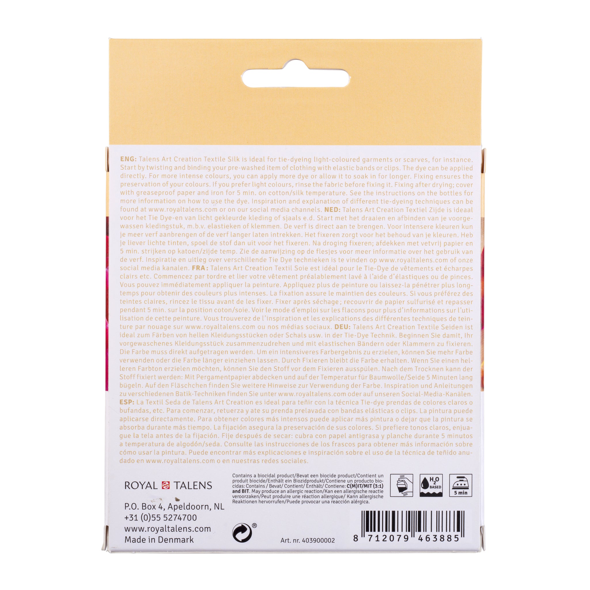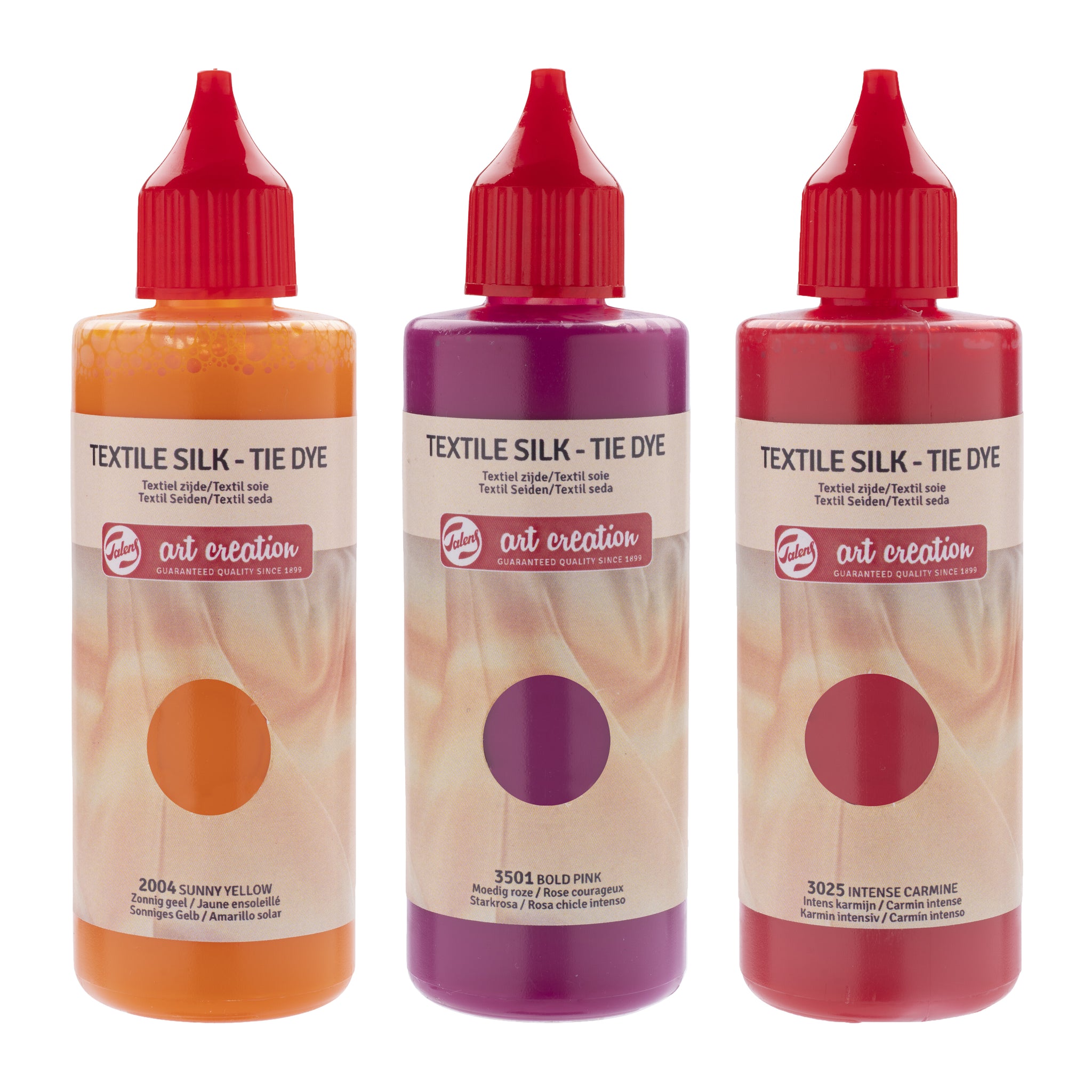 This tie-dye set contains three bottles of Talens Art Creation Silk dye, a water-based dye that is ideal for dyeing light-colored natural fabrics. The vibrant colors are ready to use and come in bottles with fine dosing nozzles to allow for even and precise application directly to the fabric. The set also includes disposable gloves to prevent staining on your hands.