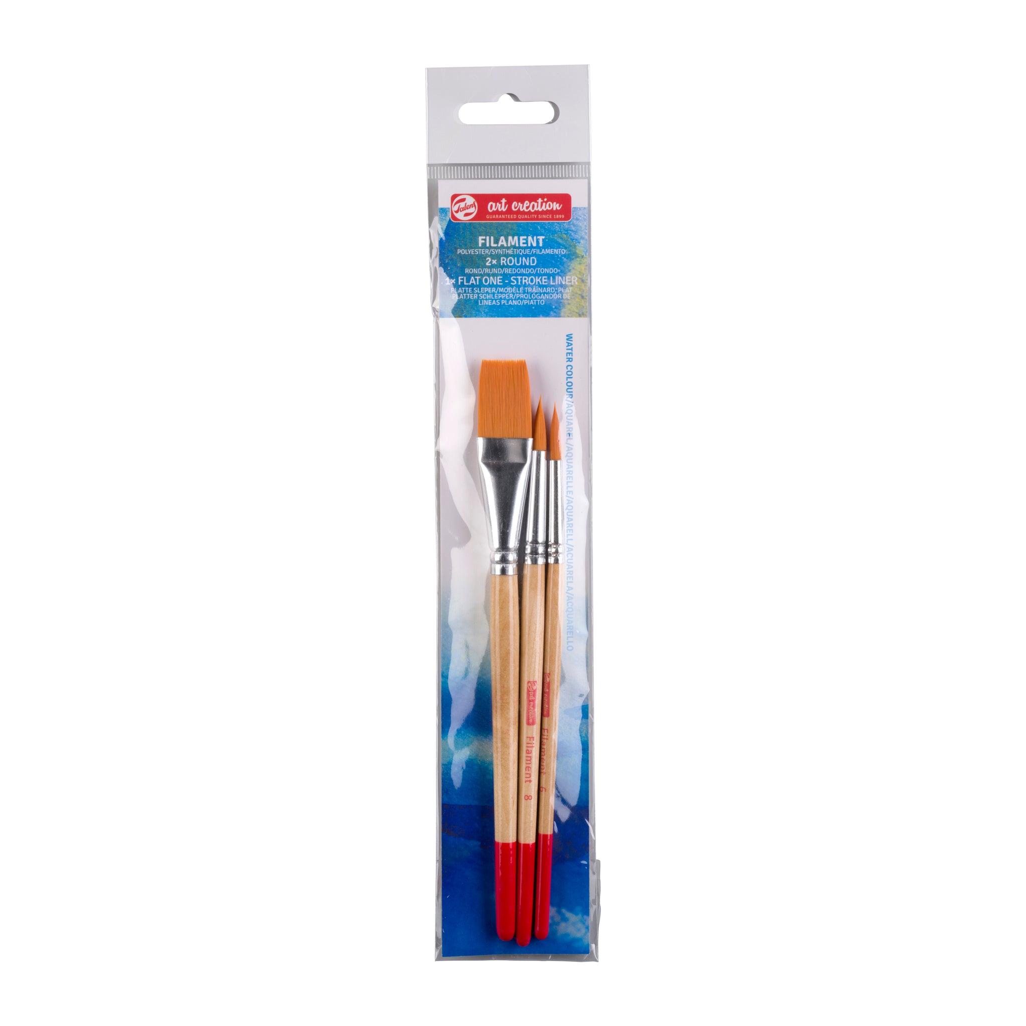• This set of 3 polyester brushes can absorb a lot of water, which makes it suitable for highly thinned paints such as watercolors and inks.