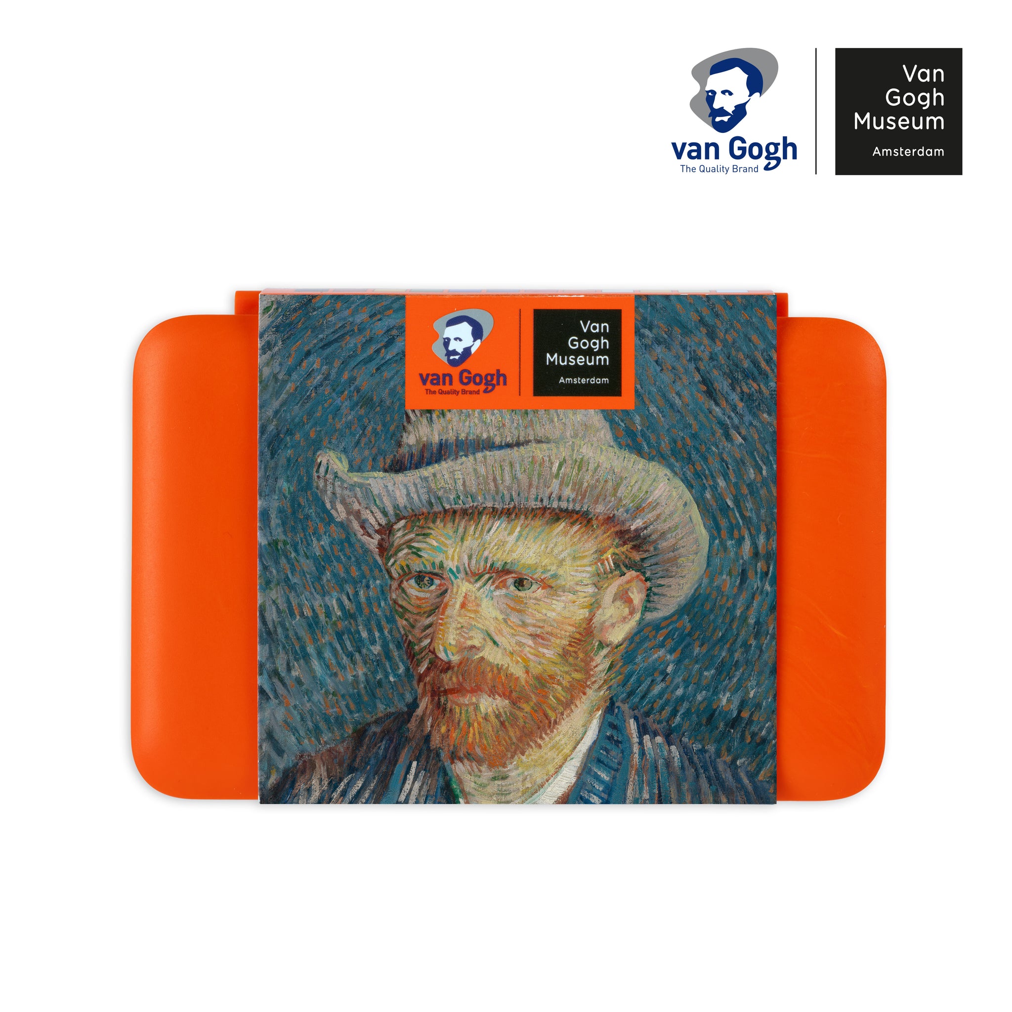 A compact watercolor set with twelve shades inspired by the color palette of Vincent van Gogh's Dynamic Self-Portrait with Grey Felt Hat in which he used complementary colors. This special edition of the Van Gogh pocket box is bright orange, like the small stripes of orange paint that can also be seen in the halo around the head in the self-portrait. This makes the water color pocket box a true collector's item.